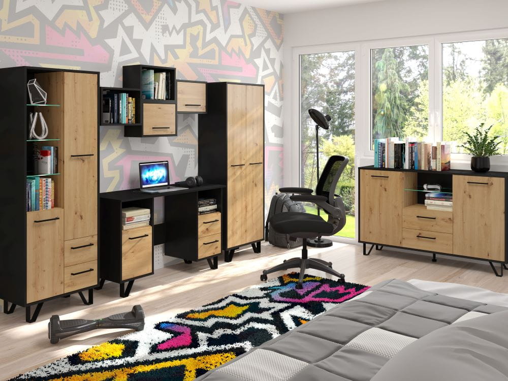 Biurko Boss (BOS01) w kolorze czarny z modnym dodatkiem dąb artisan to eleganckie biurko w przystępnej cenie. Ze względu na kolorystykę świetnie odnajdzie się we wnętrzach w stylu loft.