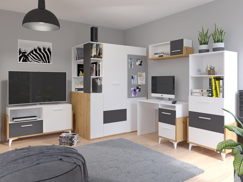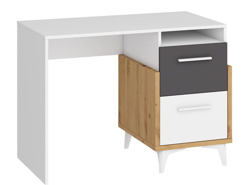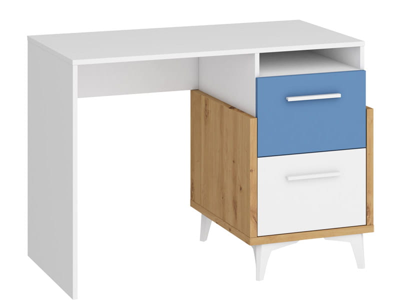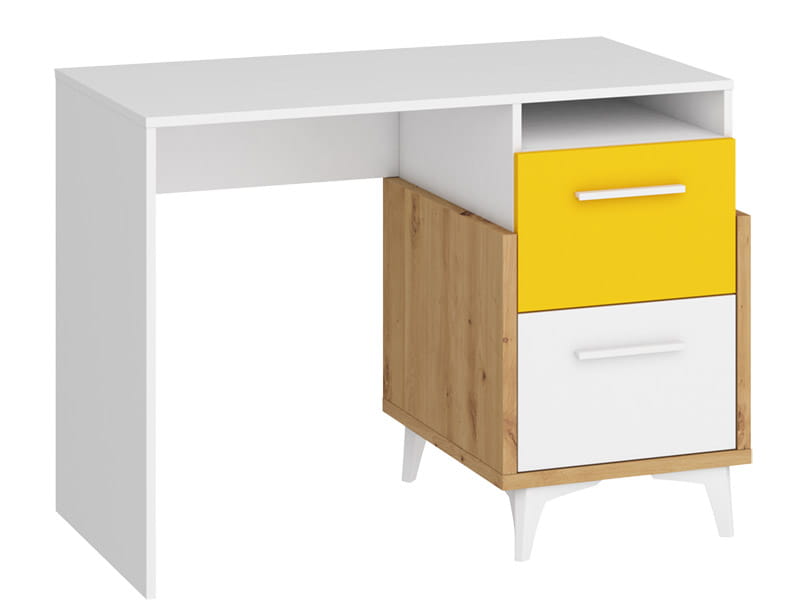 Biurko HEY wykonane w całości z laminowanej płyty meblowej w połączeniu trzech kolorów - biały jako główny, który rozjaśnia pomieszczenie, kolor dąb artisan imitujący drewno, a także kolorowy dodatek dostępny w pięciu wersjach kolorystycznych. Różnokolorowe meble to świetny pomysł by ożywić pokój dziecięcy i stworzyć mu wyjątkowe wnętrze.