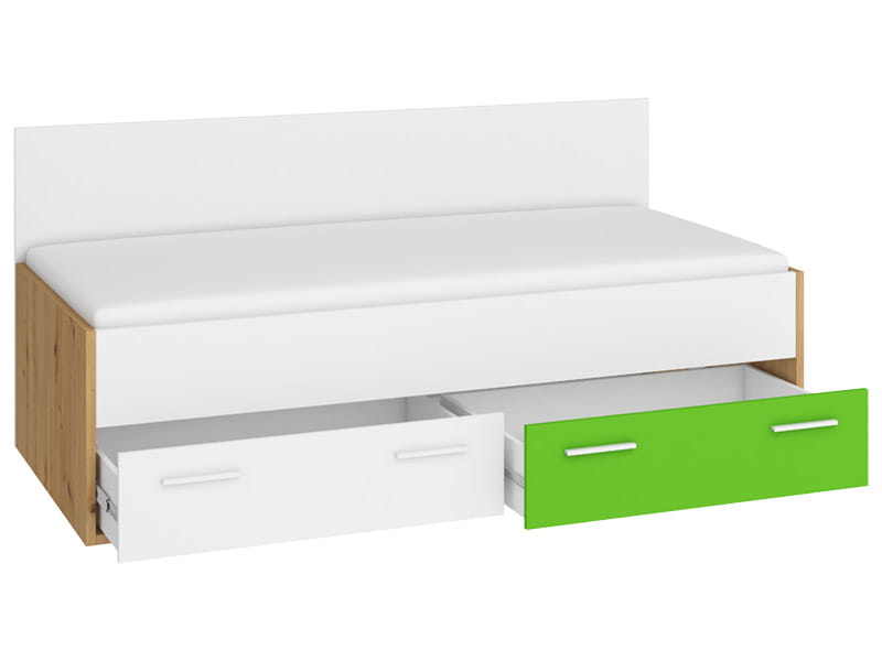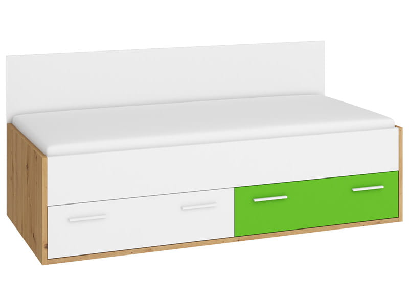 Łóżko w całości wykonane z laminowanej płyty meblowej będącej połączeniem trzech kolorów co jest charakterystyczne dla mebli młodzieżowych z kolekcji HEY. Boki łóżka w kolorze dąb Artisan, kolor główny rozjaśniający pokój to biały oraz rozweselający dodatek w postaci zielonego frontu szuflady.