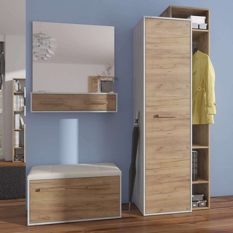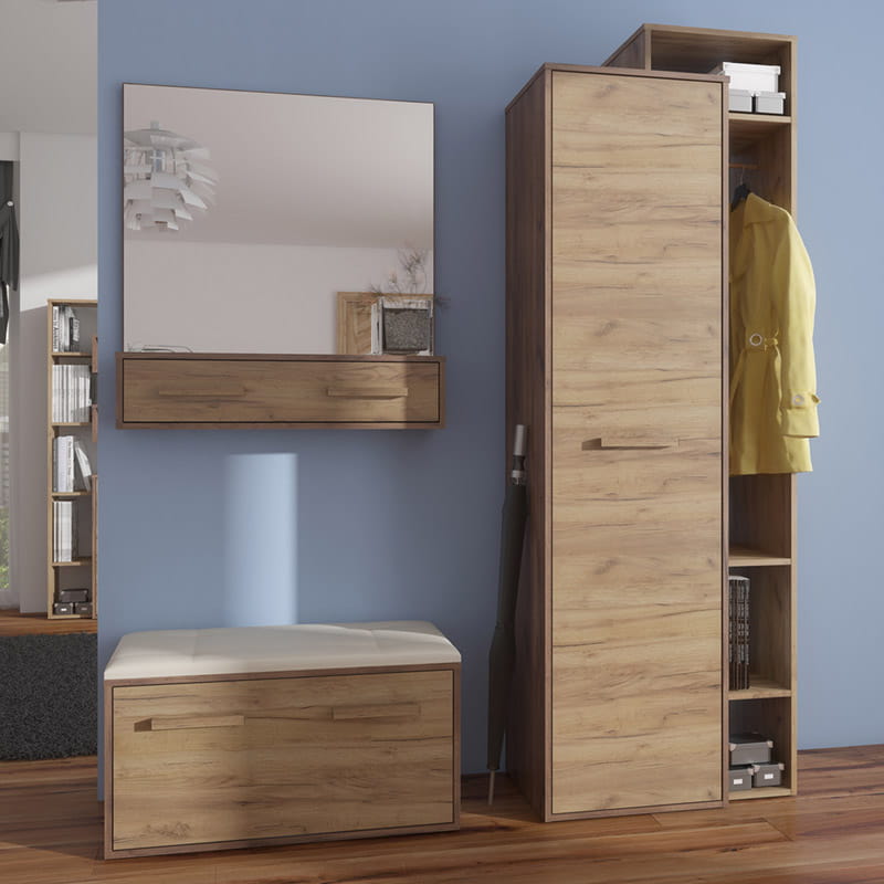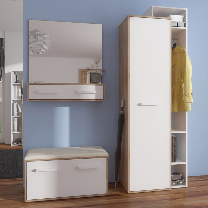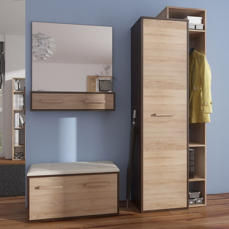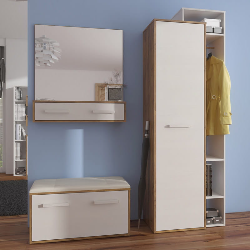 Zestaw mebli do przedpokoju Rio bardzo pojemny i funkcjonalny. Szafa z drążkiem na wieszaki będzie idealnym rozwiązaniem na odzież wierzchnią, szafka na obuwie z tapicerowanym siedziskiem pomoże założyć buty, a lustro w przedpokoju nie tylko pozwoli dokonać ostatniego przeglądu przed wyjściem ale również optycznie powiększy przedpokój.