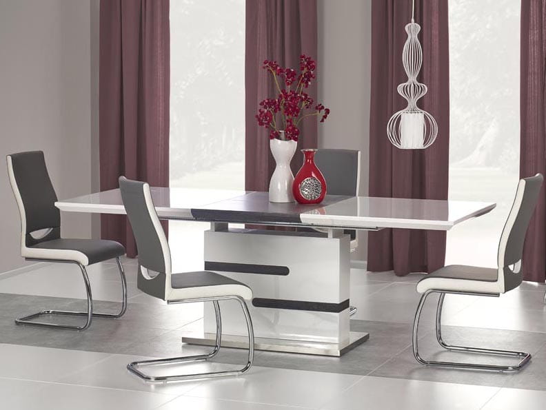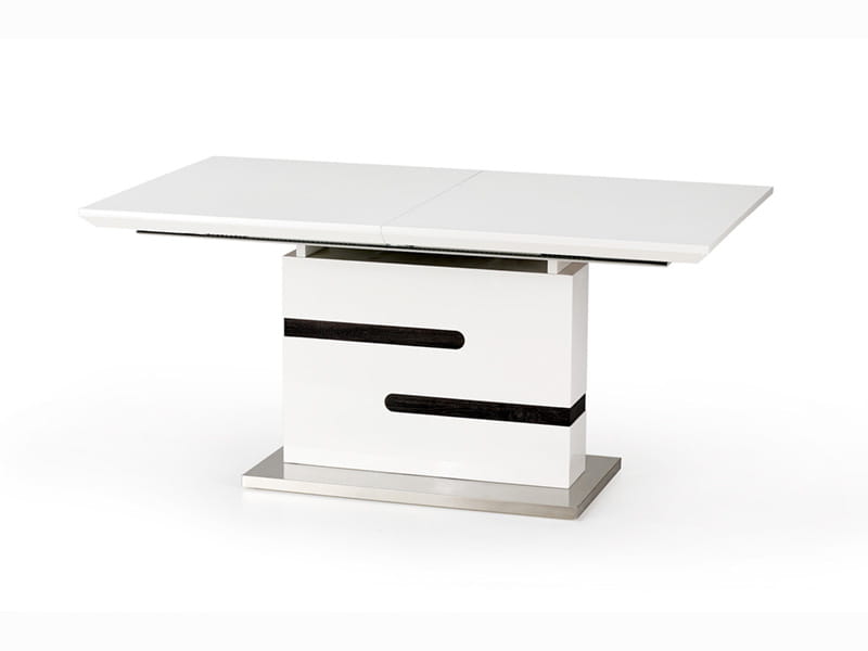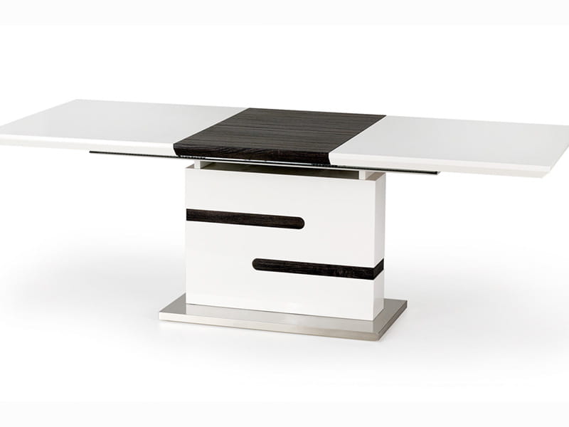 Stół Monaco wykonany z wysokogatunkowych materiałów. Rozkładany blat to połączenie lakierowanej na biało płyty MDF z laminowana wstawką również z MDF. Biały MDF z popielatymi dodatkami również jest jednolitą nogą stołu, która spoczywa na podeście ze stali nierdzewnej. Całość tworzy wyjątkowy obraz i niespotykany wygląd.