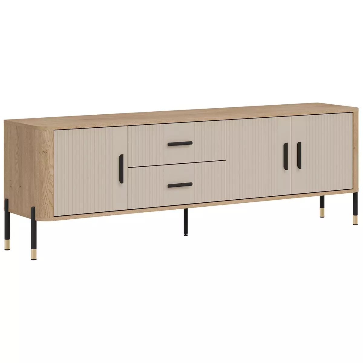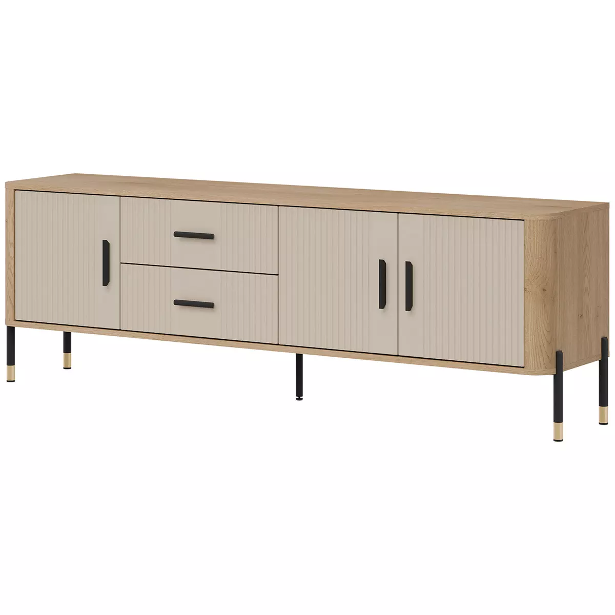 Szafka RTV Dante kaszmirowa - Dante w kolorze kaszmiru łączy elegancki mat z ciepłem dekorem Dąb Cremona Torro, serwując wnętrzu odrobinę glamour i sporo charakteru. Szeroka bryła na wysokich, czarnych nóżkach i metalowe uchwyty dopinają całość tak, jak powinien wyglądać nowoczesny salon.